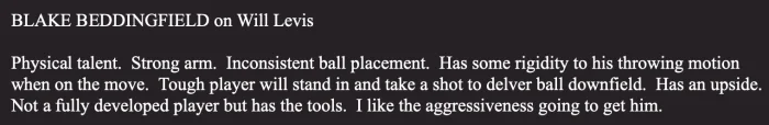 Former Titans scout and special contributor to this site Blake Beddingfield said Levis shows “inconsistent ball placement,” and he is hardly alone in that assessment. I saw it too in what I watched of the Wildcats.