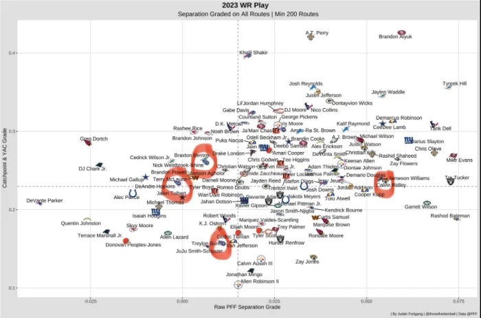 What I like most about Pearsall is his ability to create separation. According to Sumer Sports modeling data, only Texas burner Xavier Worthy created more separation on average than Pearsall’s 3.25 yards.