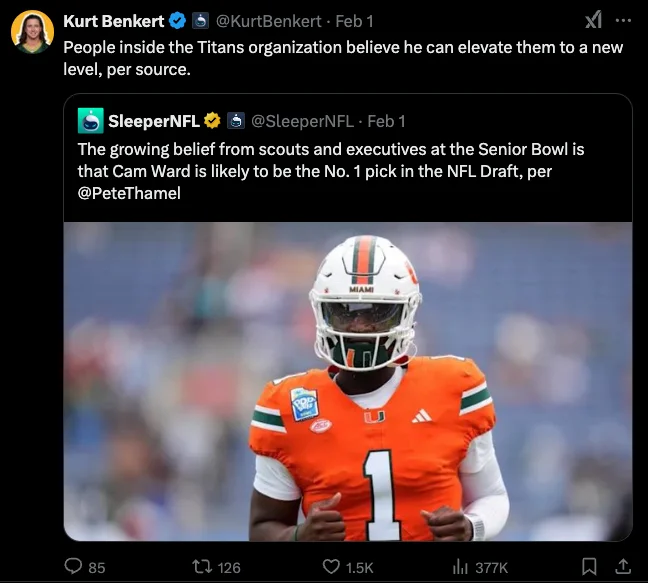 Of course, what Thamel wrote in an ESPN+ piece from the Senior Bowl was immediately followed by this: "This is more anecdotal than scientific, as neither passer (Ward or Shedeur Sander) was in town. But Ward's versatility and ability to run stand out as separating traits."